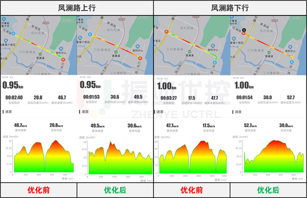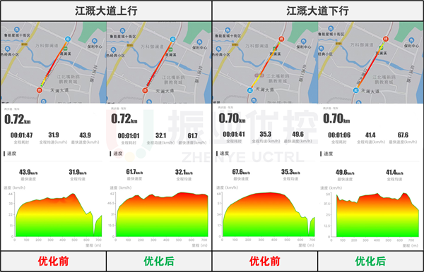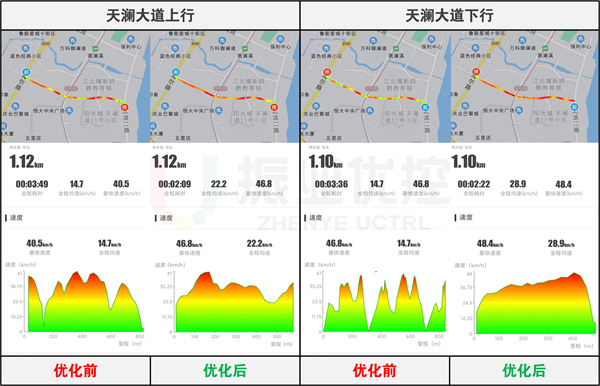 路段上行停車次數(shù)由1次變?yōu)?次,全程耗時(shí)縮短46秒;下行停車次數(shù)由1次變?yōu)?次,全程耗時(shí)縮短35秒。