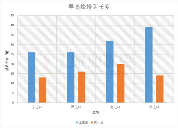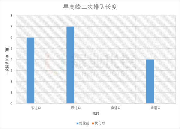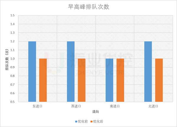 早高峰,路口各進(jìn)口平均排隊(duì)長(zhǎng)度優(yōu)化率為48.8%;各方向基本無(wú)二次排隊(duì)現(xiàn)象;平均排隊(duì)次數(shù)優(yōu)化率為13.8%。