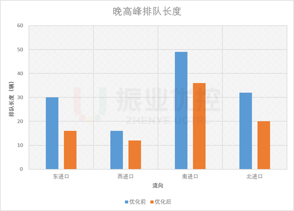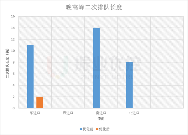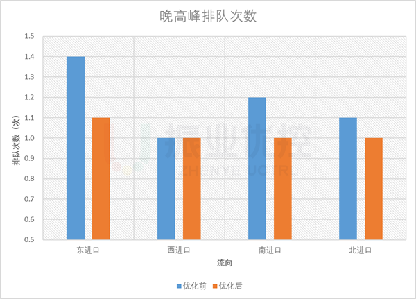 晚高峰,路口各進(jìn)口平均排隊(duì)長(zhǎng)度優(yōu)化率為33.9%;除東進(jìn)口偶爾存在輕微二次排隊(duì)外,其它方向基本無(wú)二次排隊(duì)現(xiàn)象;平均排隊(duì)次數(shù)優(yōu)化率為24.2%。
