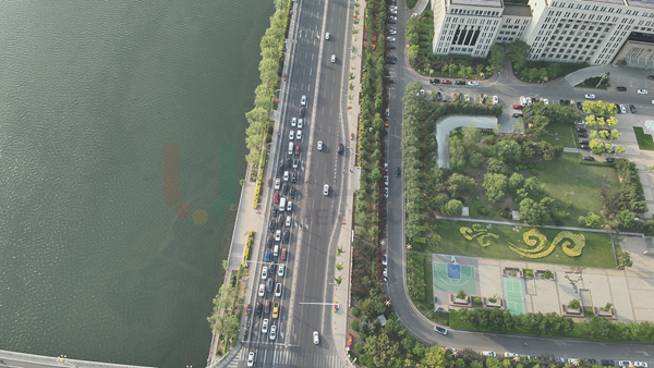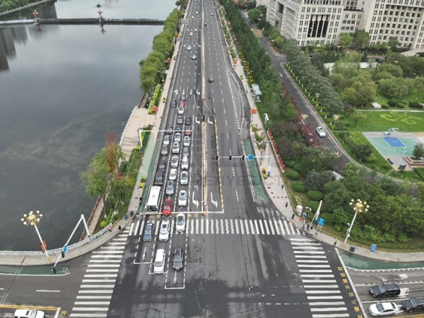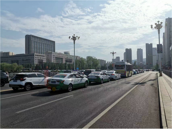 高峰期,路口各方向車流集中,處于飽和狀態(tài),南、北進(jìn)口車輛排隊(duì)長(zhǎng)度高達(dá)200m。