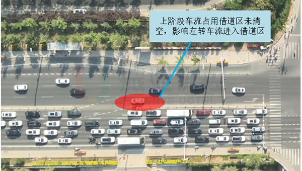 - 南、北進(jìn)口左轉(zhuǎn)車輛進(jìn)入借道區(qū)時(shí),上階段車流未能及時(shí)清空