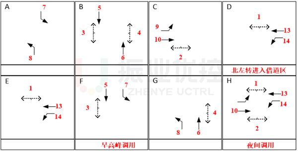 東、西進(jìn)口根據(jù)車道調(diào)整改為單放控制;北進(jìn)口左轉(zhuǎn)車輛在東單放相位(D相)進(jìn)入借道區(qū),并設(shè)置延后8s進(jìn)入借道區(qū),保證借道區(qū)車輛得以清空;各時(shí)段根據(jù)車道分配及通行流量數(shù)據(jù)重新設(shè)計(jì)配時(shí)方案。
