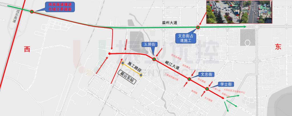 由于成眉市域鐵路S5線眉山東和音樂廣場兩個地鐵站占道施工,高峰時段部分過境、通勤車輛選擇繞行岷江大道進入主城區(qū),導(dǎo)致岷江大道西向東車流激增,造成疊加擁堵。