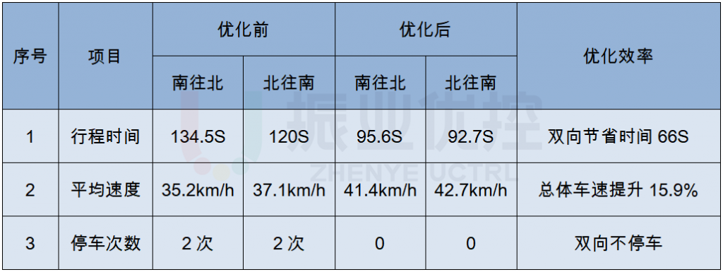 路段停車次數(shù)明顯減少,雙向停車次數(shù)由4次下降至0次,實(shí)現(xiàn)雙向不停車通過。