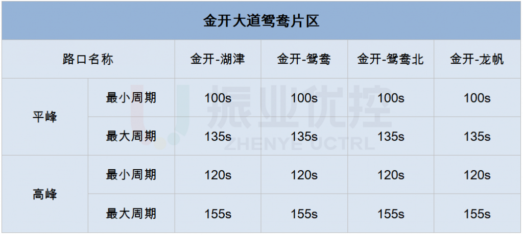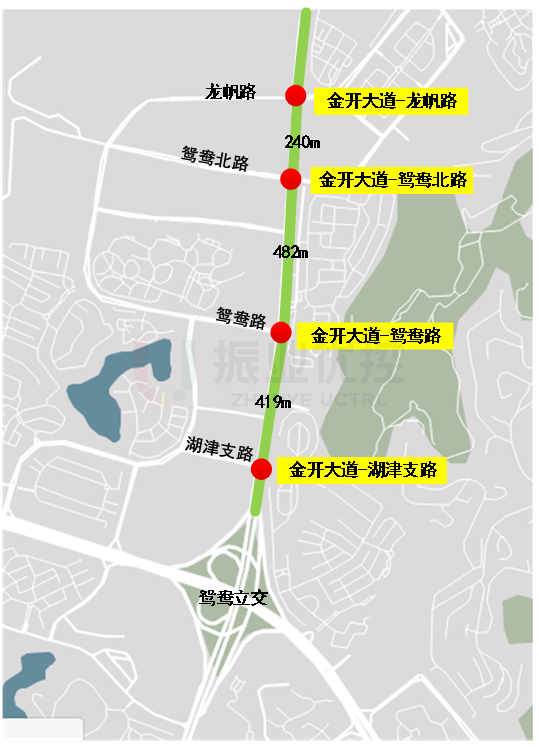 該路段全長1.1km,雙向6車道,沿線分布金開大道-湖津支路、金開大道-鴛鴦路、金開大道-鴛鴦北路、金開大道-龍帆路4個(gè)信控路口,并均已實(shí)現(xiàn)聯(lián)網(wǎng)控制。