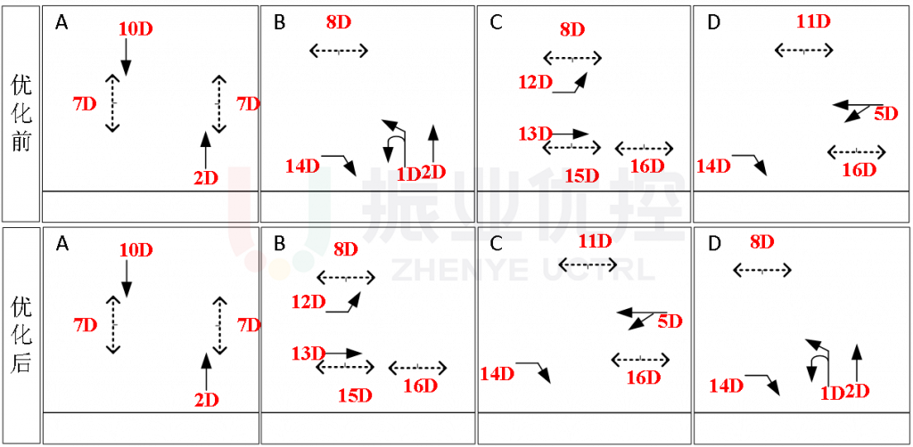 根據(jù)路段協(xié)調(diào)需求,對金開大道-鴛鴦北路、金開大道-龍帆路、金開大道-湖津支路等路口的相位相序進(jìn)行調(diào)整。