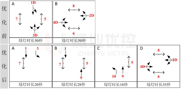 本案例中新改(擴(kuò))建的城市道路,通過優(yōu)化相位相序,將原來的簡單兩相位調(diào)整為直行-左轉(zhuǎn)搭接相位相序,減少沖突和延誤;并根據(jù)車流量變化情況,調(diào)整配時,減少支路空放情況,提高綠燈利用率;同時將上下游路口進(jìn)行聯(lián)動綠波協(xié)調(diào),讓信號燈更智能,進(jìn)一步提升通行效率。
