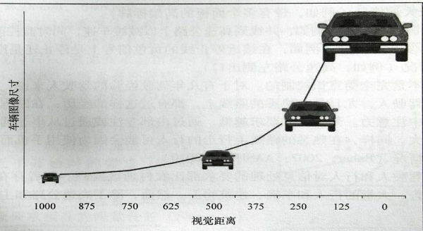 而基于視覺(jué)的生物特性,因?yàn)橐曈X(jué)距離和車(chē)輛圖像大小之間的關(guān)系并非線性關(guān)系,從而增加了道路使用者估算速度的難度,特別是當(dāng)車(chē)輛所占視角的變化速率小于0.2度/秒時(shí),觀察者無(wú)法檢測(cè)到圖像大小在變化(如圖1)。