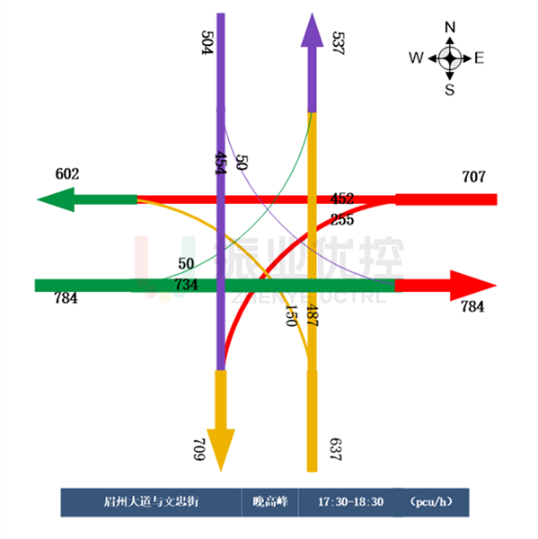 擁堵主要集中在晚高峰時段,根據(jù)車流量數(shù)據(jù)統(tǒng)計,晚高峰時段每小時通行流量高達2632輛,其中,東進口左轉(zhuǎn)與西進口直行的車流量較大。