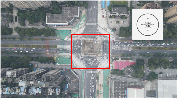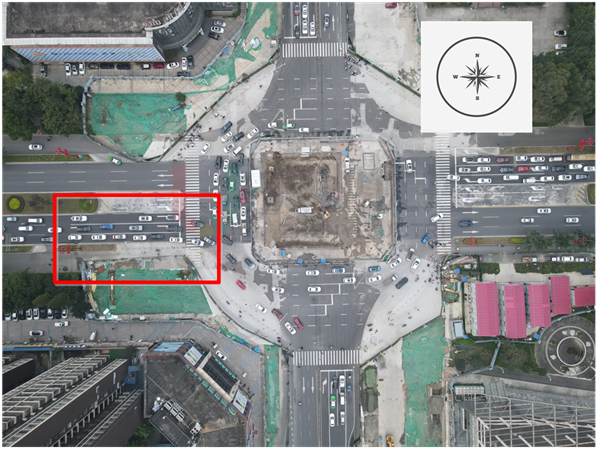近期,因成眉市域鐵路S5線音樂廣場站建設(shè)需要,眉山大道與文忠街交叉口中間位置及各進口道均存在圍蔽施工區(qū)域;交叉口也配合改造為臨時環(huán)島交叉口,并在各進口道和島內(nèi)分別設(shè)置信號燈,對相應的車流進行燈控。