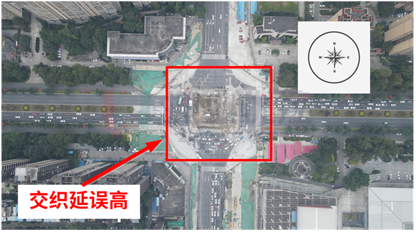 西進口進城方向車流量大,特別是晚高峰,高達784輛/小時,綠燈時間無法滿足車流通行需求。加上圍蔽施工,交叉口內(nèi)車流通行緩慢,導致西進口車輛排隊長度高達700米,互聯(lián)網(wǎng)平臺擁堵指數(shù)由6.81上升至12.58,上升了84.5%。