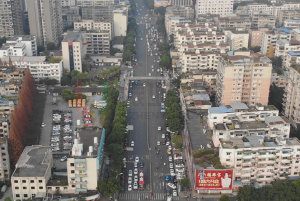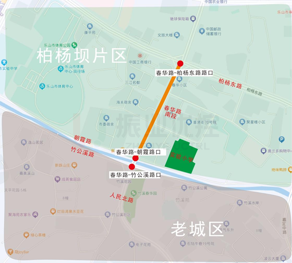 春華路是連接柏楊壩片區(qū)與老城區(qū)的重要道路,高峰期南段過境通勤交通流壓力較大。樂山市實驗小學位于柏楊壩片區(qū)春華路南段東側(cè),路段上下學接送需求大,過境通勤與接送車流重疊導(dǎo)致路段高峰期擁堵較為嚴重。