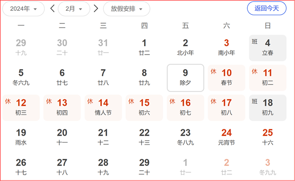 根據(jù)國務(wù)院辦公廳通知精神,2024年春節(jié)放假時間為2024年2月10日(星期六,初一)至2月17日(星期六,初八)放假調(diào)休,共8天。2月4日(星期日)、2月18日(星期日)上班。