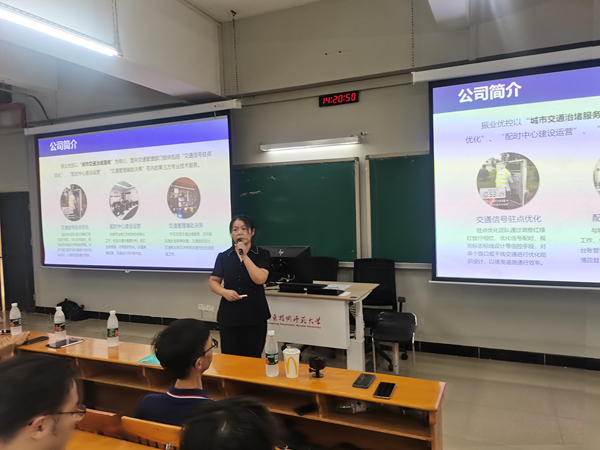 隨后,大灣區(qū)智慧交通創(chuàng)新聯(lián)盟椒醬團(tuán)隊(duì)兩位專家進(jìn)行主題分享。振業(yè)優(yōu)控專家組組長(zhǎng)賴城南以《城市道路交通治堵新模式及人才需求》為題,分享了自身在交通信號(hào)配時(shí)、交通組織優(yōu)化、綠波協(xié)調(diào)等方面的深厚技術(shù)積累與豐富實(shí)戰(zhàn)經(jīng)驗(yàn)。他憑借生動(dòng)的案例和詳實(shí)的數(shù)據(jù),為同學(xué)們展現(xiàn)了城市道路交通治堵的嶄新模式,同時(shí)指明了智能交通領(lǐng)域?qū)θ瞬诺男枨蠓较颉?/p>